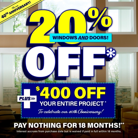 *20% discount applied by retailer representative at time of contract execution and applies to purchase of any combination of 4 or more windows and/or doors. May not be combined with other offers or prior purchases. Offer expires 4/30/26. Promotional offer available without financing option. **Subject to credit approval. 18-month Promo Period when no payments are due and interest accrues but is waived if balance is paid in full before Promo Period expires. Any unpaid balance owed after Promo Period plus accrued interest will be paid in installments based on terms disclosed in the financing agreement. Financing is provided by various financial institutions without regard to age, race, color, religion, national origin, gender, or familial status. “Renewal by Andersen” and all other marks where denoted are marks of Andersen Corporation. © 2026 Andersen Corporation. All rights reserved.